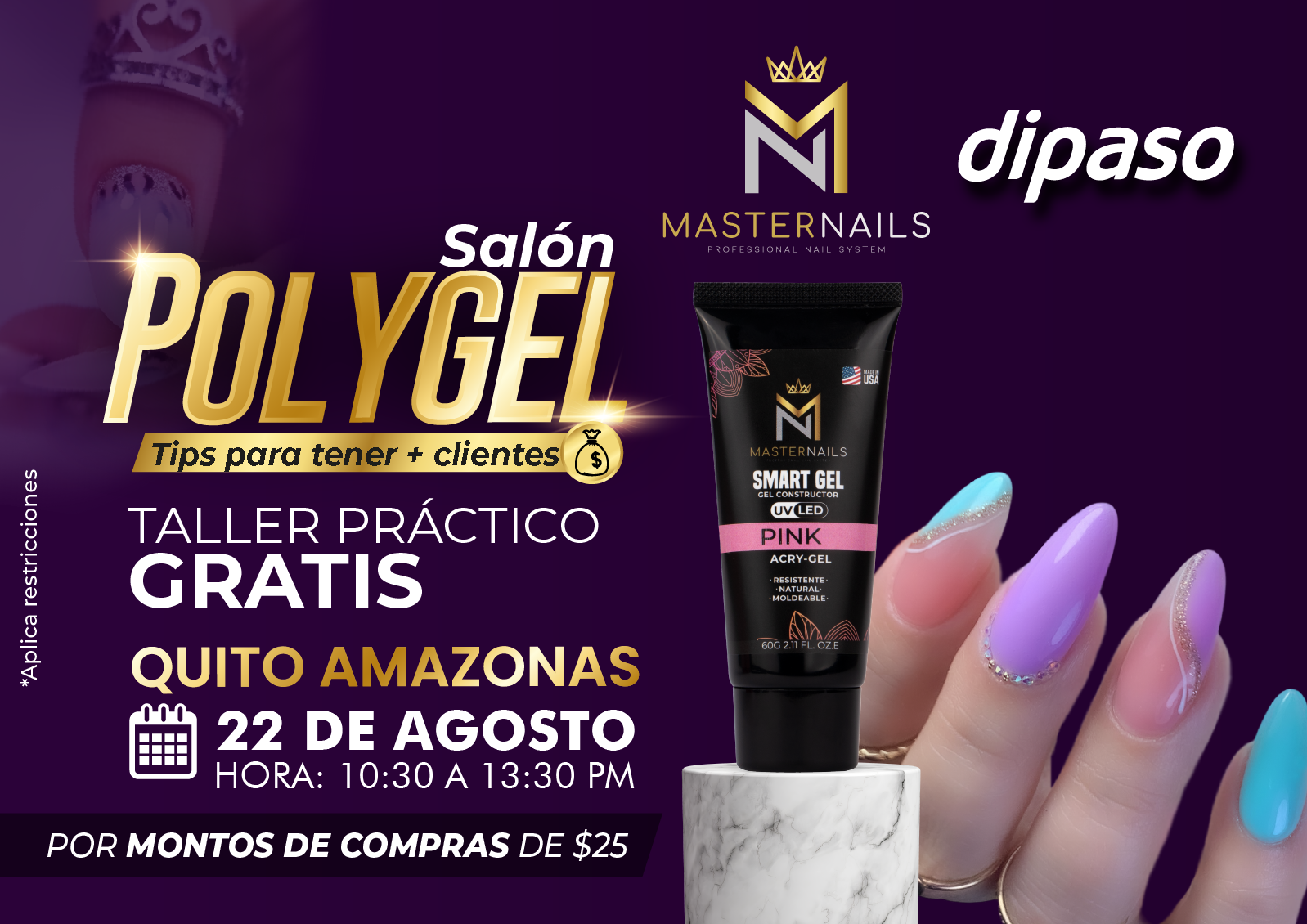 Salon Polygel tips para tener mas clientes ✨ FORMULARIO DE REGISTRO Taller al que te deseas registrar: ---Salon Polygel DAULE (22 de Agosto)Salon Polygel QUITO AMAZONAS (22 de Agosto)Salon Polygel MALL DEL FORTIN (24 de Agosto)Salon Polygel MACHALA SUCRE (30 de Agosto) Subir fotografía de la factura:(Obligatorio) + Añadir Google Calendar Exportación + iCal Fecha Ago 22 2023 Hora 10:30 am - 1:30 pm Valor POR MONTOS DE COMPRA DE $25 Localización DIPASO QUITO Amazonas Quito, Joaquín Pinto & Avenida Amazonas Categoría Uñas Organizador GRUPO DIPASO S. A. Teléfono 0962962293 Correo electrónico admweb@dipaso.com.ec Web https://www.dipaso.com.ec/ Compartir este evento